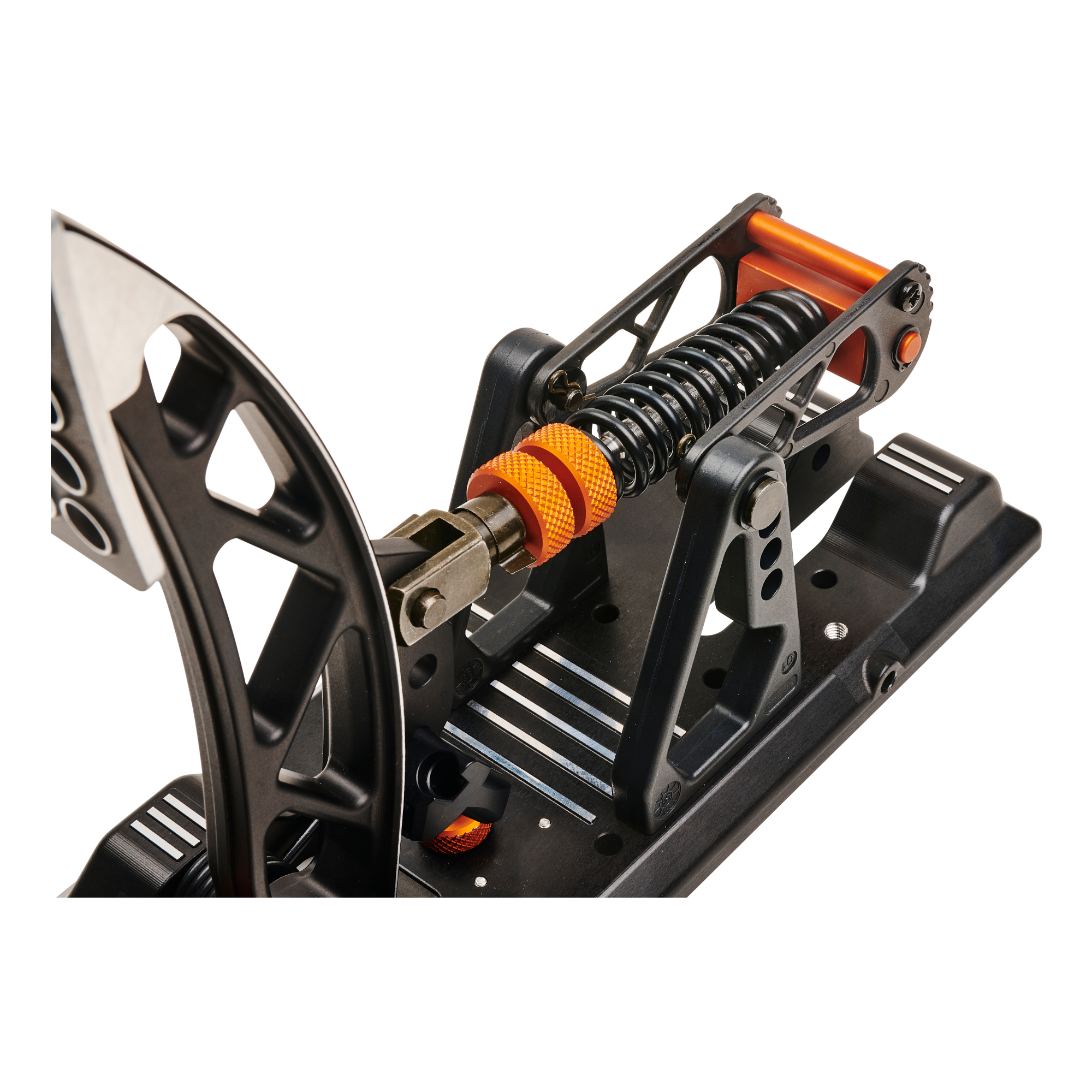Die-cast aluminium zero play pedal arm with integrated long durability ball bearings and bronze bushing at the clevis rotation point